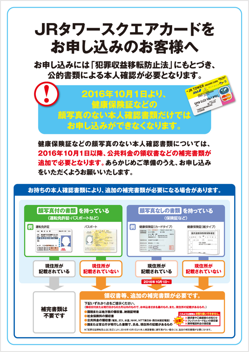 ≪ご確認下さい≫JRタワースクエアカードへの新規入会時の必要書類が変更になります -