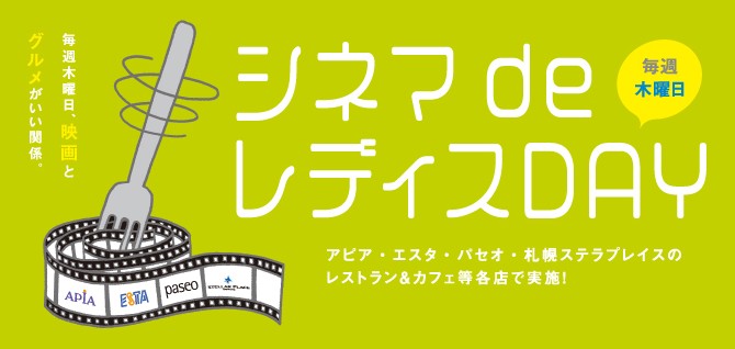 札幌シネマフロンティア・レディスデー(毎週木曜日)の映画当日券またはその半券をご提示いただくと、 アピア・エスタ・パセオ・札幌ステラプレイスのレストラン&カフェ等各店で特典いろいろ。 男性のみでもご利用いただけます。