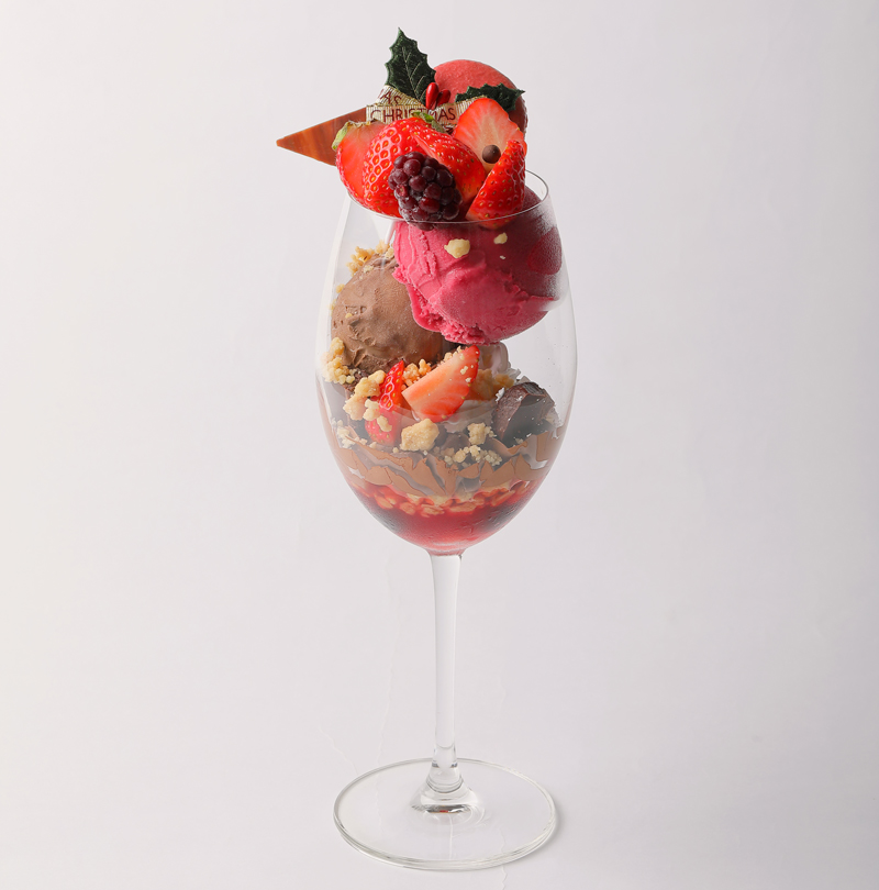 フレッシュなイチゴの下には甘酸っぱいカシスアイス、その下には濃厚なチョコレートアイス&チョコホイップと、濃厚でありながらさっぱりとした味わいを楽しめる中、グラノーラや生チョコなど、さまざまな食感もプラス!クリスマス限定の特別な味わいを、目の前の絶景とともにお楽しみください!