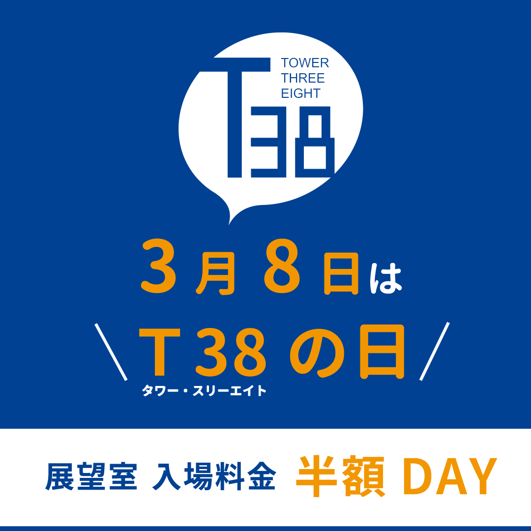 JRタワー展望室T38では、3月8日を「T38(タワー・スリーエイト)の日」として、当日に限り、一般入場料金の半額でご入場頂くことができます!